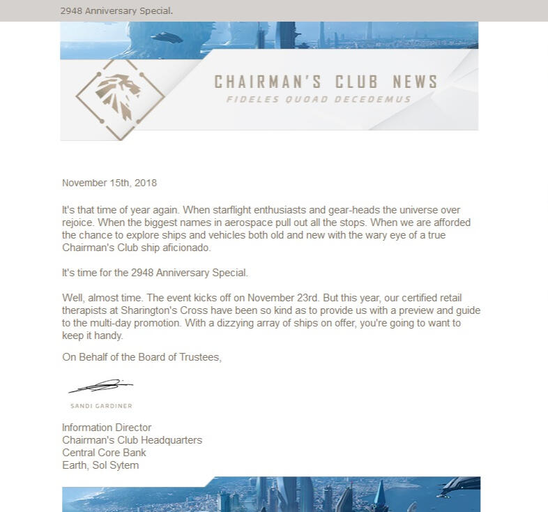 A monthly publication tailored specifically to our VIP backers, this newsletter always dipped liberally in and out of lore in a fun way, but was mostly a way to give the Concierge members a first look at upcoming ships and promotions.